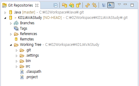 - 오른쪽 위 Git 퍼스펙티브 아이콘을 누르면 Git 저장소 정보를 확인할 수 있다. ‘Working Tree’를 선택하고 하위 디렉터리를 살펴본다.