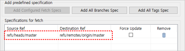 ‘Push Ref Specifications’ 창이 나타나는데 ‘Source Ref’ 항목에서 master[branch] 를 선택한후 ‘Add Spec’ 버튼을 누른다.