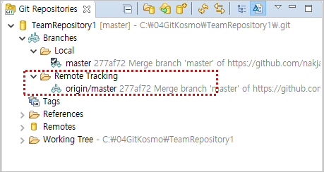 그러면 아래와 같이 Branches > Remote Tracking 하위에 항목이 생성된다.