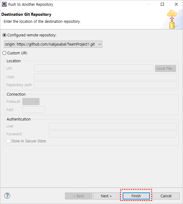 ‘‘Specifications for push’ 의 ‘Source Ref’과 ‘Destination Ref’ 항목에 ‘refs/heads/master’ 라고 설정되어 있다면 정상적으로 설정된 것이다. 확인했다면 [Finish]를 클릭한다.