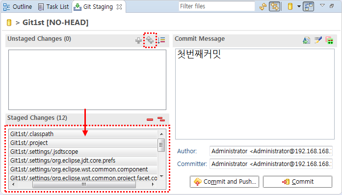 아래와 같은 창이 뜨면 ‘Commit message’항목에 알맞은 메시지를 작성한 후 방금 만든 프로젝트 파일 전체를 ‘Staged Changes’로 옮긴다. 그런 후에 마지막으로 <Commit>을 누른다.