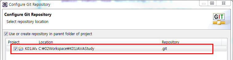 Use or create repository in parent folder of project 부분을 체크하고 Create Repository버튼을 클릭한다.