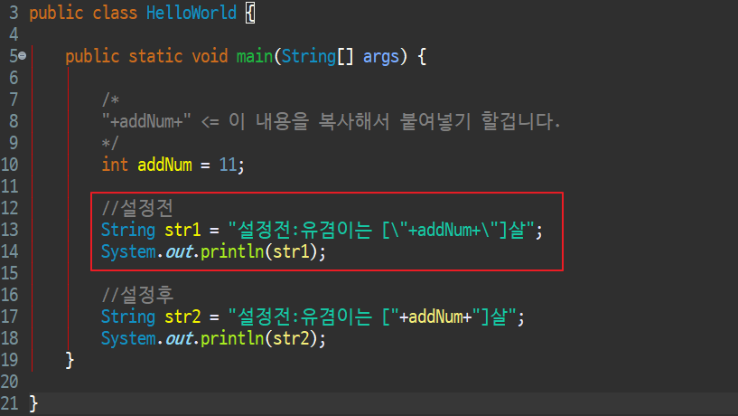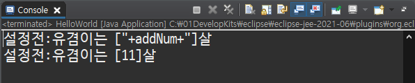Java 코딩시 문자열 사이에 변수를 입력할때는 더블쿼테이션 과 + 기호를 사용해야 합니다.