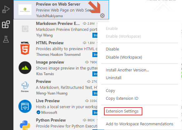 만약 포트충돌로 정상적으로 실행되지 않는다면 톱니바퀴를 눌러 메뉴에서 Extension Setting으로 들어갑니다.