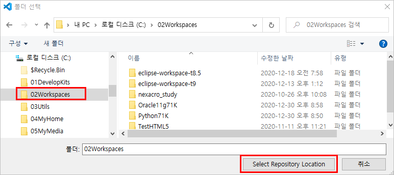 URL 입력후 Enter를 누르면 다음과 같이 폴더선택 창이 뜰것이다.