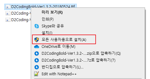 압축해제 후 설치할 폰트 선택 > 우클릭 > 모든 사용자용으로 설치 클릭한다.