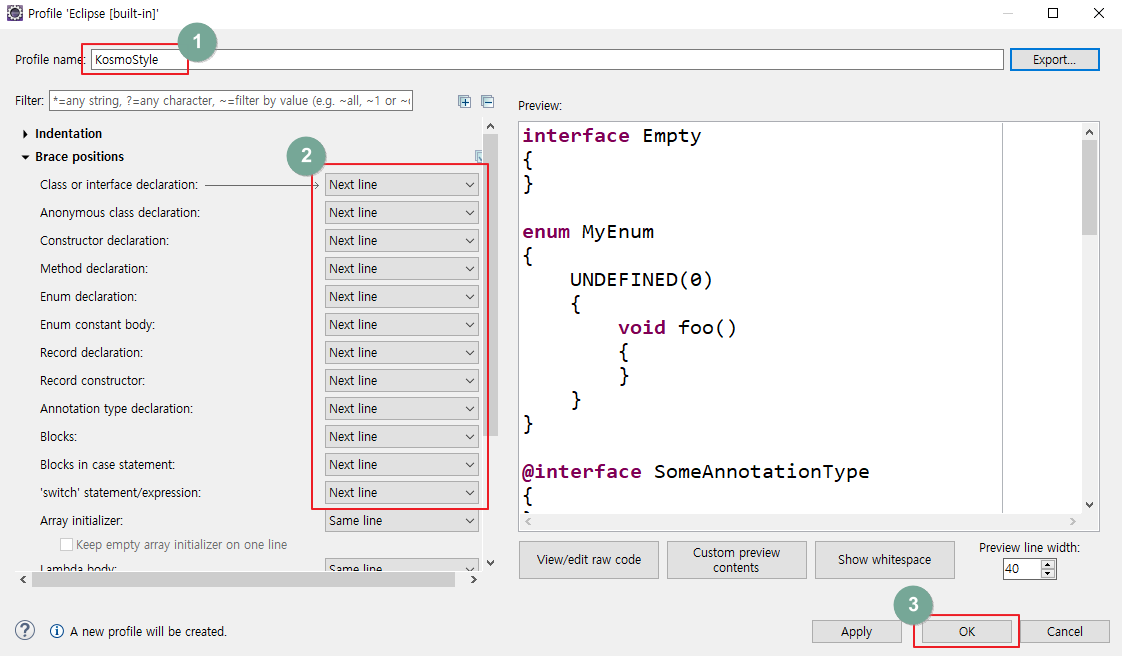 설정화면 으로 진입하여 Profile name에 본인이 원하는 이름을 입력한 후 Brace positions를 “Next Line” 으로 변경한다. 변경된 내용은 우측의 Preview 화면에서 실시간으로 확인할 수 있다.