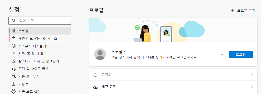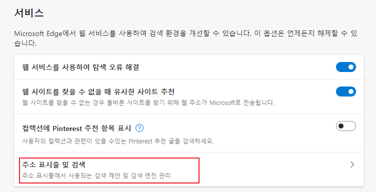 다음 화면에서 스크롤을 아래로 쭈~욱 내려주시면 서비스 항목에서 주소 표시줄 및 검색이 있습니다.